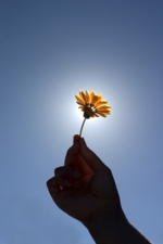 - 中間の黄色は人々の笑顔が地平線の向こうで輝いているイメージです。生命(いのち)の象徴で、その微笑みMoment of Smile™の輝きを表しています。