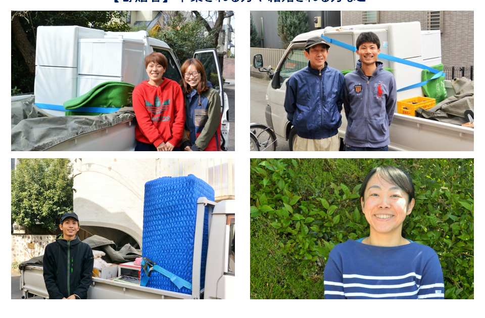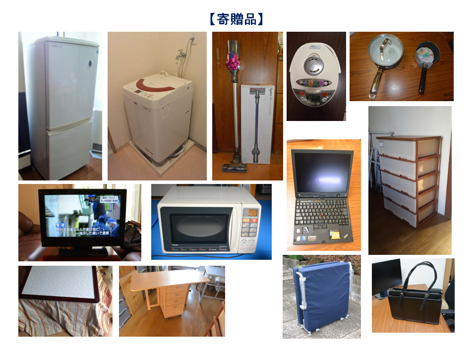 - 地域の企業やNPO、任意団体、大学ボランティアと一緒に、不要となったひとり暮らし用電化製品や家具を卒業者アンケート調査にもとづいて集める。