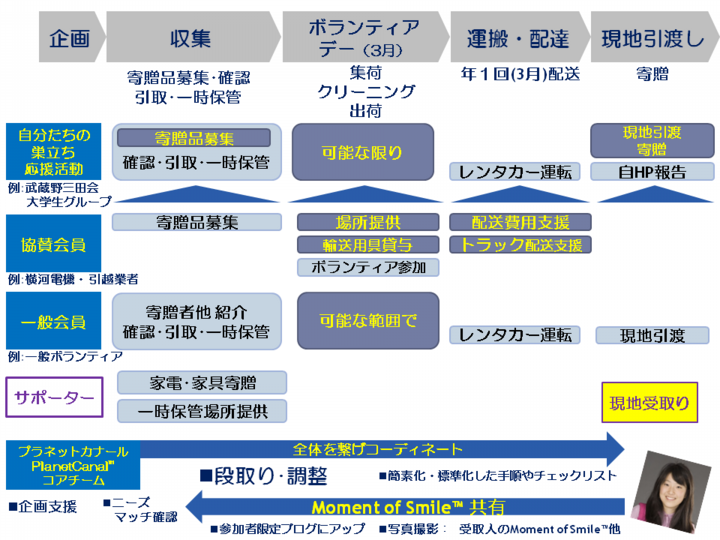 まず、日本国内プロジェクトとして、児童養護施設を巣立つ子どもたちに運びにくい一人暮らし用家電・家具を届ける活動を支援します。また、子どもたちのための物資を運び届けるための点検・仕分・梱包などの作業をボランティア会員によってご支援します。輸送にお金がかかり手続きも難しい海外の子どもたちに学用品などを贈る場合は、協賛会員に輸送や保管の未利用隙間スペースを提供いただき届けるご支援をしていきます。名実ともにプラネット上をゆったりで流れる運河サービスになっていきます。