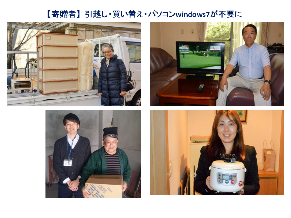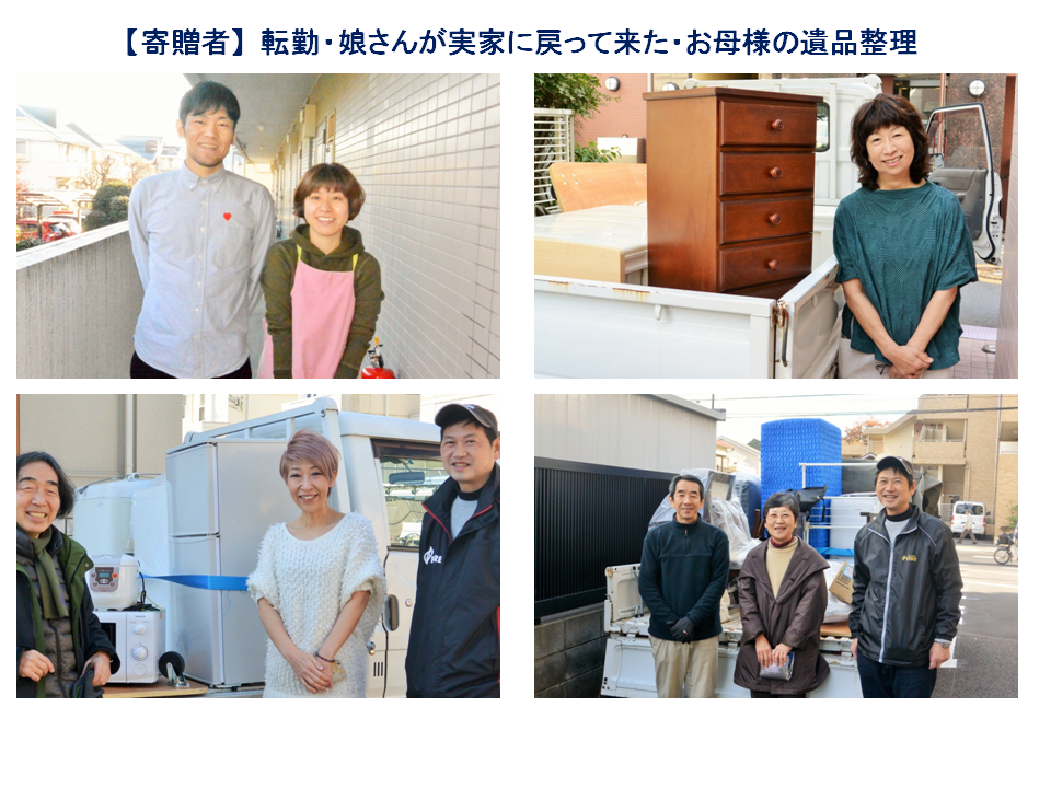 一人暮らし用電化製品や家具の具体的ニーズはアンケートで事前に調査します。多少の変更もあるとは思いますが、ニーズにあるモノのみを集め、品質状態を確認し、一時保管し、クリーニングして送り届けます。ひとり暮らし向きでないものは部屋のスペースや電気代を考えると贈れません(特に冷蔵庫など)。新生活に相応しい質の良いモノを贈りたいと思っています。
